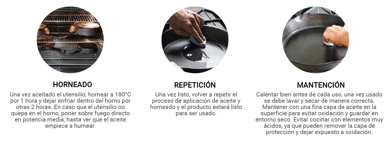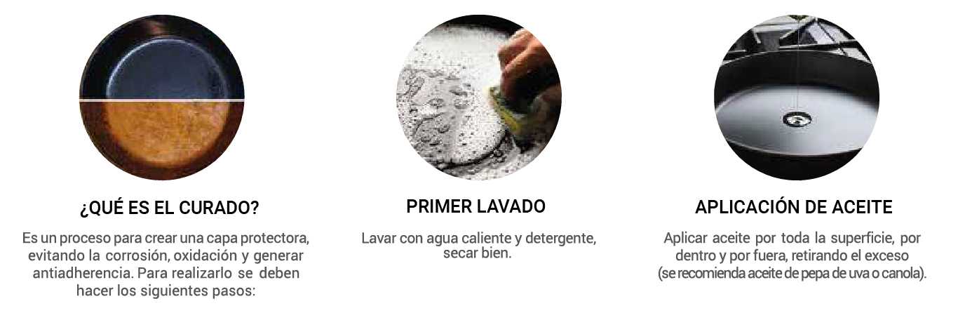 La curación es un procedimiento que crea una capa protectora sobre el hierro, evitando la corrosión, reduciendo la oxidación y otorgando un acabado antiadherente natural. Este tratamiento no aplica a piezas esmaltadas o de acero inoxidable, sino exclusivamente a productos de fundido.