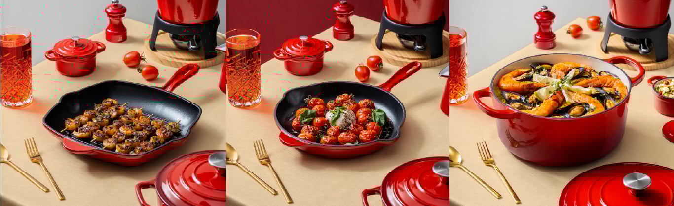 Las piezas de fierro esmaltado Lugano destacan al primer vistazo. El esmaltado exterior —con un acabado liso y brillante— aporta un color intenso y duradero que realza cualquier ambiente: rojo potente, negro clásico o tonos neutros que armonizan con vajilla, cristalería o utensilios de cocina. Al mirar de cerca, se aprecia la textura uniforme y los bordes cuidadosamente redondeados, lo que evidencia una manufactura cuidada y profesional.